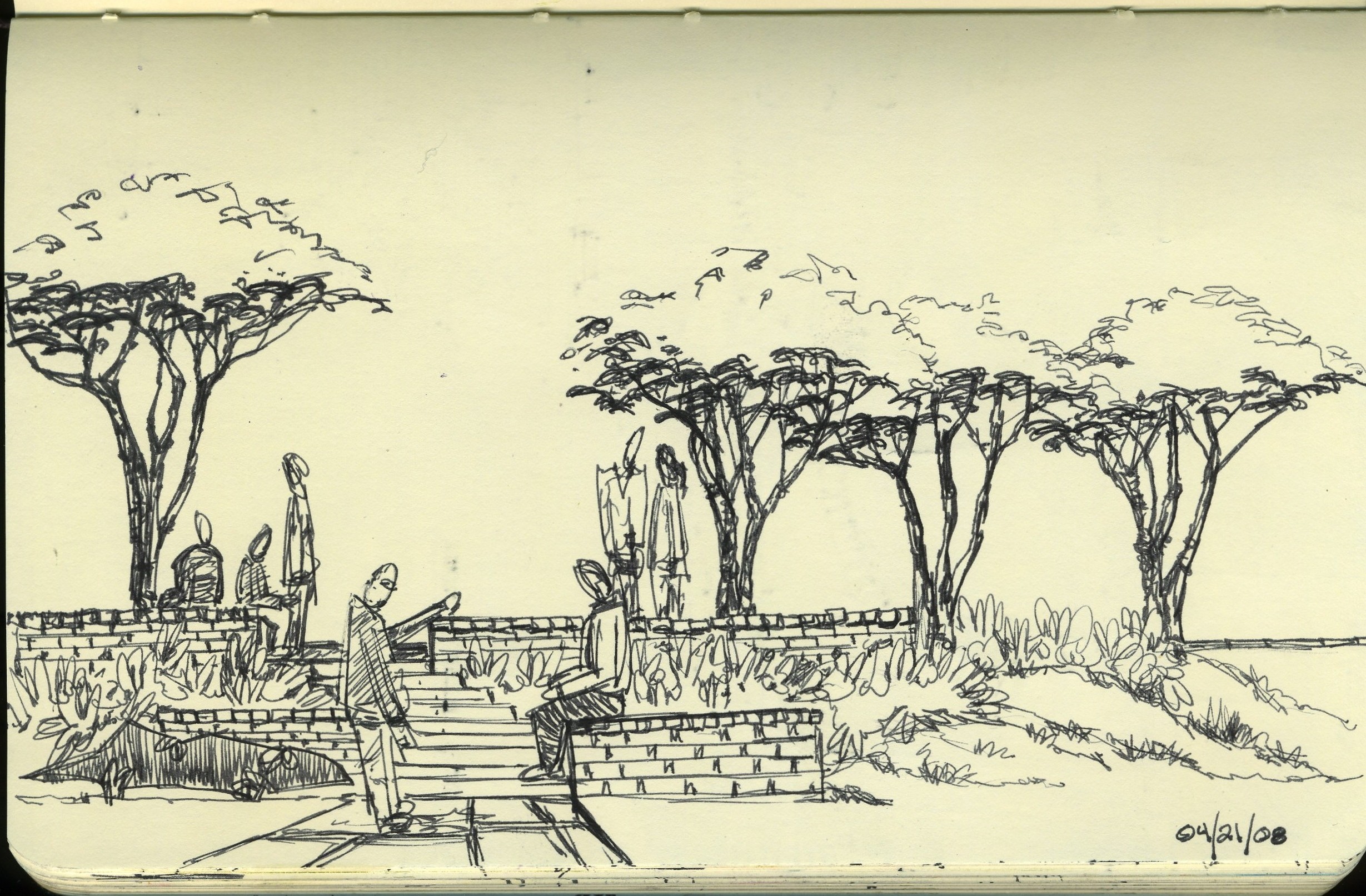 Addendum: The top sketch was done on a sheet of copy paper-from a stack of copy paper on the clipboard. I had reached a point where I was stuck on this concept. So I got up, grabbed the clipboard and a cup of coffee and went out and sat in the backyard . . . drawing away . . . trying to find an idea or two to put together for this two-level plaza.